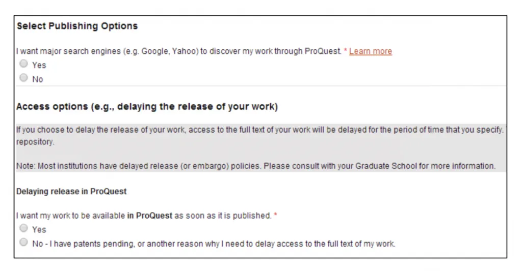 The second half of the PQ Publishing Options page asks you to select your publishing and access options.