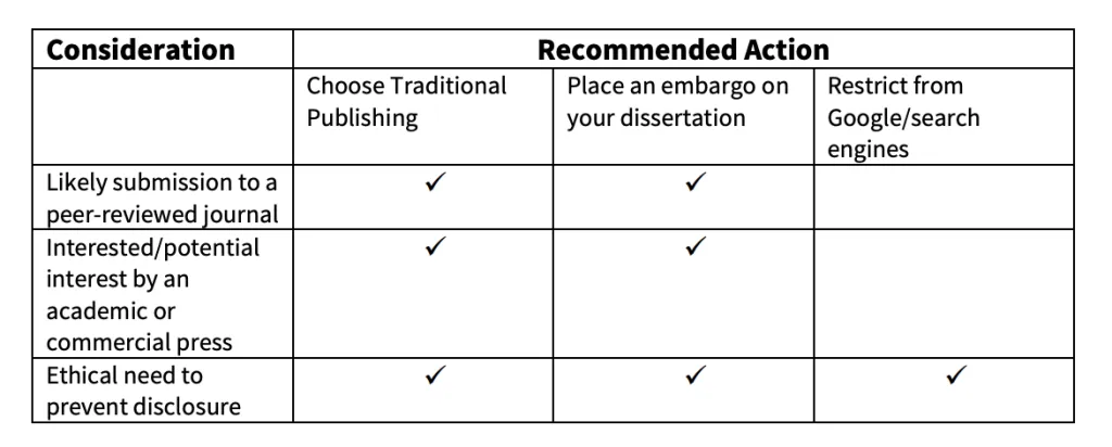 The table below, from ProQuest, is an excellent summary of the advice our office would give you about whether or not you should embargo your dissertation.